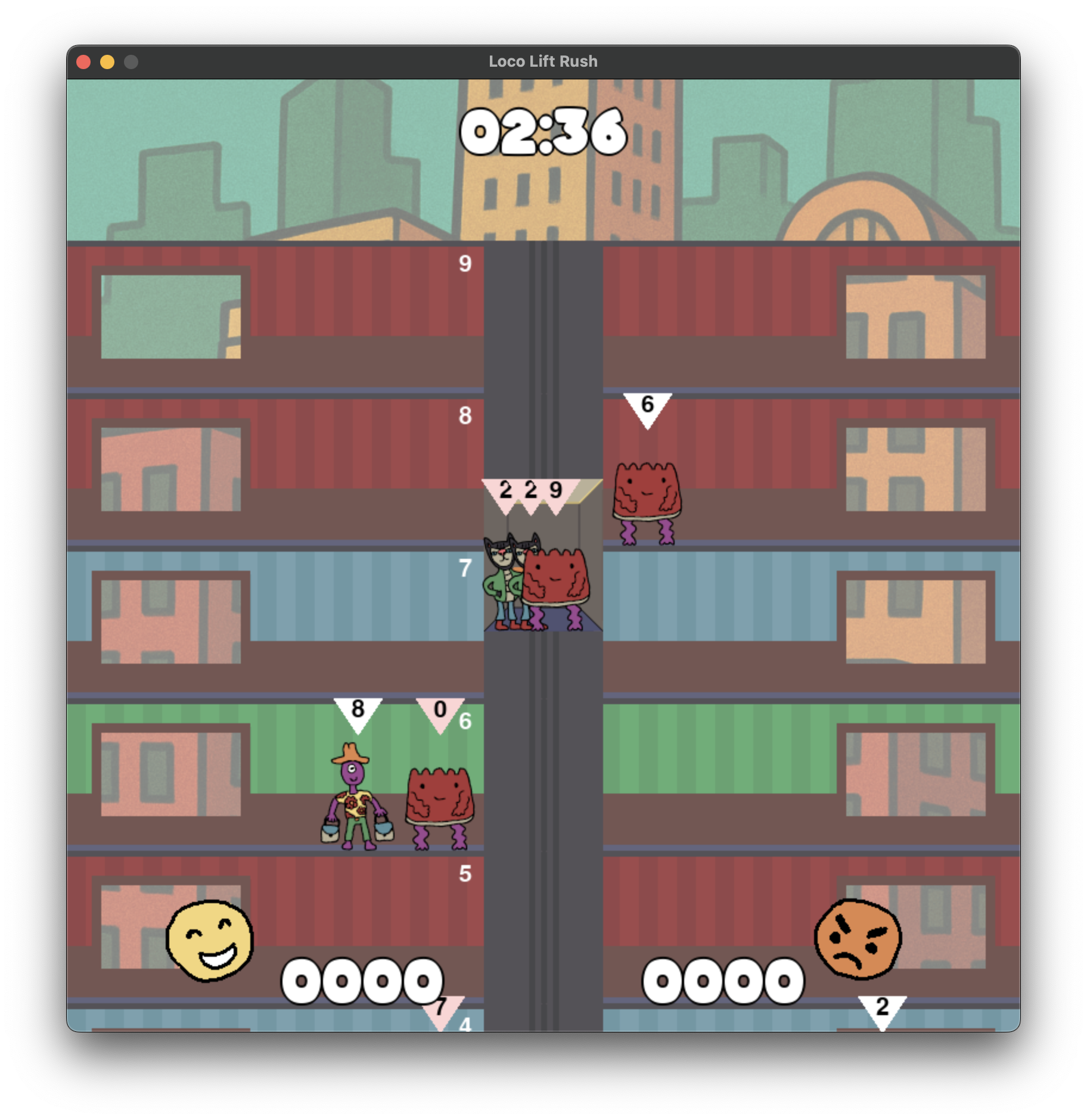 My concept is super simple - you control a lift going up and down the floors of a skyscraper, collecting passengers before they lose their patience, and dropping them off at the floor they want. My working title is "Loco Lift Rush".